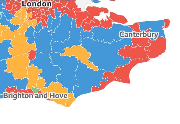 The Conservatives have managed to retain many of their districts, such as Orpington, Sevenoaks, Old Bexley & Sidcup and Tonbridge. But Labour have begun to move in as the map highlights some large areas of red support.