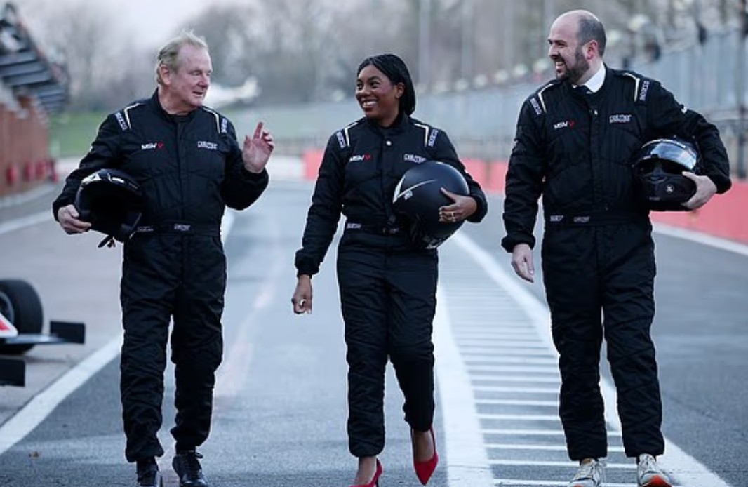 Tory leader Kemi Badenoch was seen wearing a high pair of heels today as she met up with circuit CEO Jonathan Palmer and tried out racing cars at Brands Hatch.
